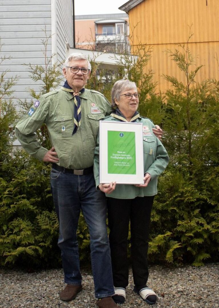 Bildet viser ekteparet Runar og Anne Marie Jakobsen idet de mottar frivillighetsprisen av ordfører Monica Myrvold Berg og hovedutvalgsleder Mads Hilden i Drammen kommune. Ekteparet ble tildelt frivillighetsprisen 2020 av Drammen kommune for sitt arbeid for barn og unge gjennom speider'n i mange tiår.